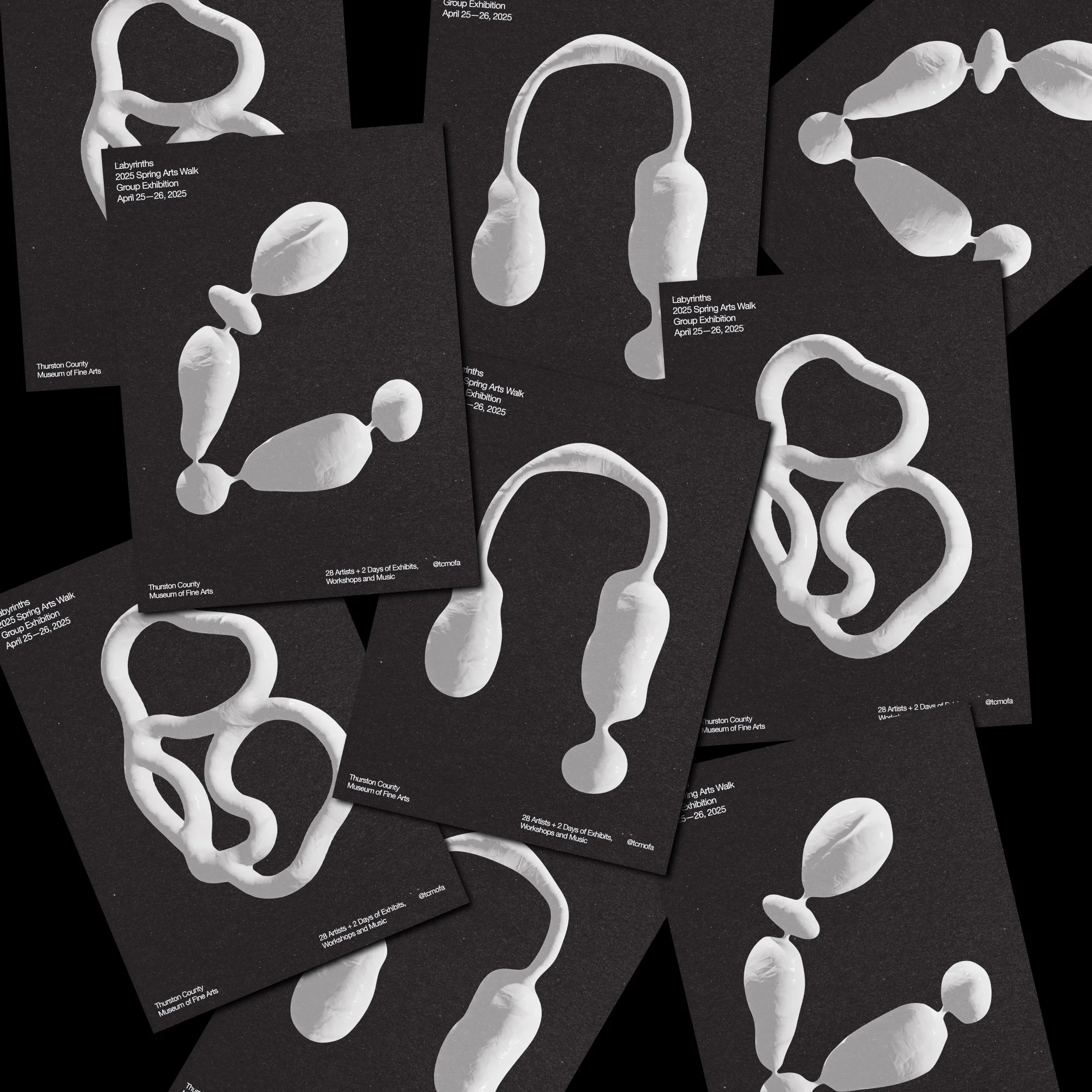 Drawing from labyrinth forms and growth patterns found in nature, we constructed digital sculptures and animated typography to create a complete visual language for this exhibition featuring 28 artists in Olympia, Washington.